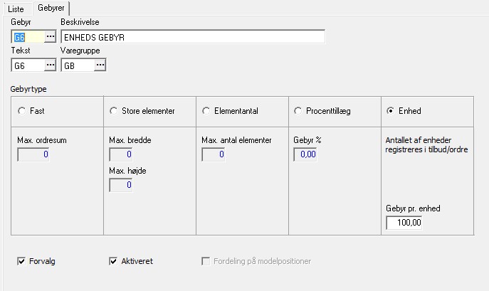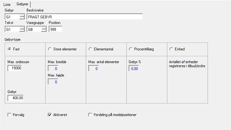 For at et gebyr skal kunne anvendes fra tilbud/ordre, skal der være sat et flueben i feltet ”Aktiveret”.