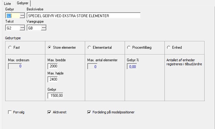 Denne gebyrtype udløses på tilbud/ordrer med elementer, der overskrider den registrerede max. bredde og den registrerede max. højde.