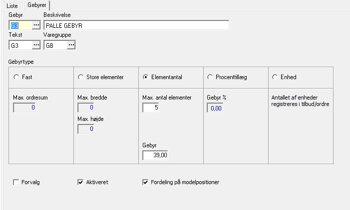 Denne gebyrtype udløses på alle tilbud/ordrer med modelpositioner. Gebyrets størrelse afgøres ved følgende formel: elementantal / max. antal elementer * gebyr beløb. Fx [12 / 5 *39 = 2,4 ~ 3] eller [3 / 5 = 0,6 ~ 1].