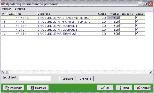 Samtidig kan man i picklisten vælge om rabatsatsen skal være synlig på udskriften eller ej. Har man en længere liste og søger en bestemt position eller vinduestype, er det muligt at benytte søgefunktionen, hvor man kan indtaste hele – eller dele af beskrivelsen.
