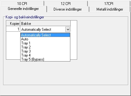 På fanebladet "Generelle indstillinger" vælges hvilken papirbakke i printeren, papiret skal tages fra ved udskrivning. Samtidig angives det antal kopier, der ønskes udskrevet.