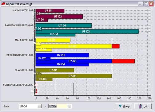 På kapacitetsoversigten vises belastningen udad X-aksen i %. De røde søjler er overbelastningen. Opad Y-aksen vises de afdelinger/arbejdscentre/fabrik, man har udvalgt som flaskehalse.
