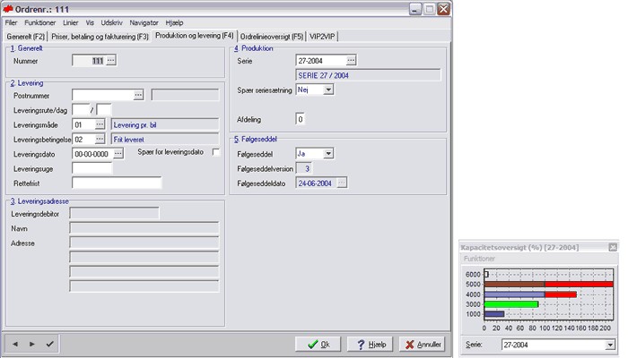 Den udvidede kapacitetsoversigt bliver løbende opdateret. Når man benytter udvidet kapacitetsvisning, kan man stadig få vist den alm. kapacitetsoversigt på skærmen i forbindelse med ordreregistreringen. Den vil vise belastningen på den serie, man seriesætter på.