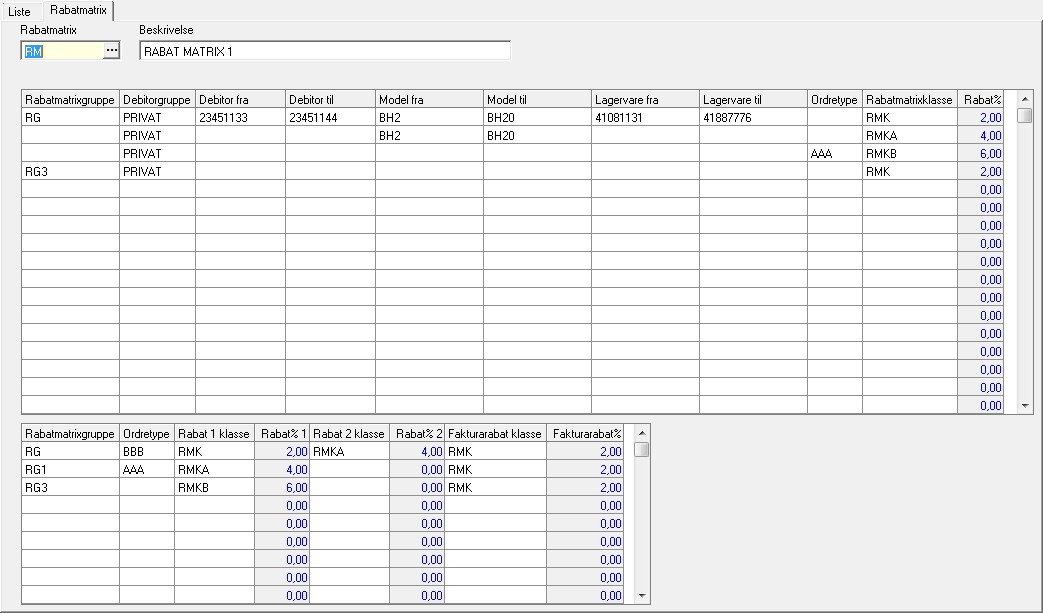 Rabatmatrix anvendes til at overstyre/indsætte rabatter på tilbud og ordrer. Den øverste af de to matricer anvendes til at bestemme rabat på tilbud- og ordrelinjer medens den nederste matrix anvendes til at bestemme fakturarabat og bundrabat 1 og 2 på tilbud/ordre-hoveder. En valgt linjerabat fra øverste rabatmatrix vil overstyre den linjerabat, der måtte være kommet fra hovedets linjerabat, og en valgt bundrabat 1 og 2 fra nederste rabatmatrix vil overstyre hovedets bundrabat 1 og 2. Fakturabatten har kun betydning for systemer med integration til C5, og fakturabatten kan udelukkende indsættes på hovedet via denne matrix.